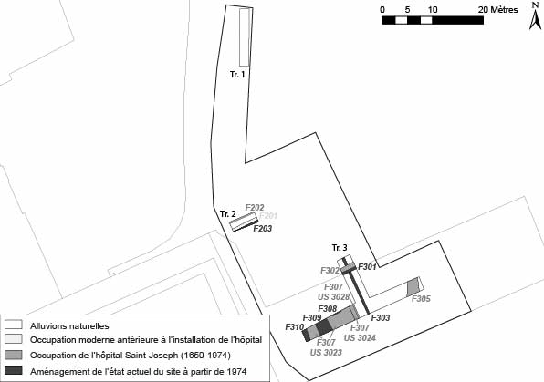 Réalisée en bordure de la rive gauche de la Mayenne, à environ 85 m de son cours actuel canalisé au 19e siècle, l’intervention s’insère sur la frange sud de l’un des principaux faubourgs de la ville, le faubourg dit « du Pont-de-Mayenne », développé au débouché du seul pont médiéval permettant le franchissement de la Mayenne et édifié de façon certaine avant 1188. L’espace sur lequel a porté le diagnostic ne sort toutefois de l’ombre qu’à la fin du 15e siècle. En effet, en 1489, le comte Gui XVI y installe un domaine seigneurial dit « l’enclos des Lices », principalement destiné à la pratique de la joute. Au milieu du 17e siècle, ce domaine change de vocation et accueille l’hôpital Saint-Joseph, puis Saint-Julien, desservi par les religieuses de la congrégation de sœurs hospitalières de Saint-Joseph. Il conserve cette fonction jusqu’en 1974 puis est occupé, à partir de 1978, par une maison de retraite. Ce changement s’accompagne d’une réorganisation importante de la partie orientale du site, marquée par la démolition de certaines constructions, l’édification de nouveaux locaux techniques et l’aménagement d’un parc, toujours existant aujourd’hui et au sein duquel s’est déroulée l’intervention.
